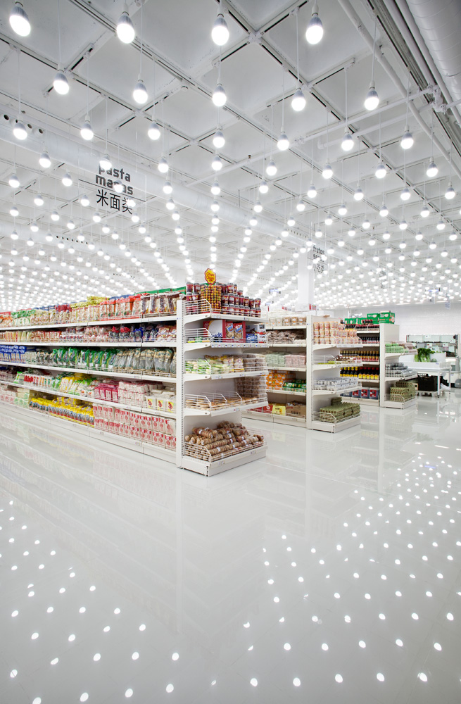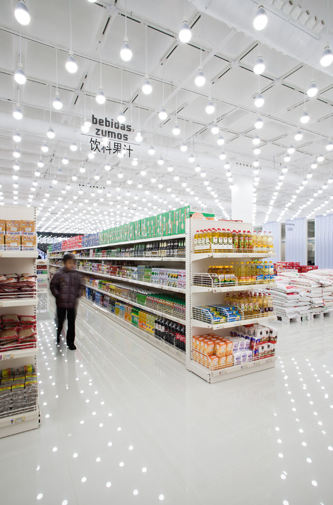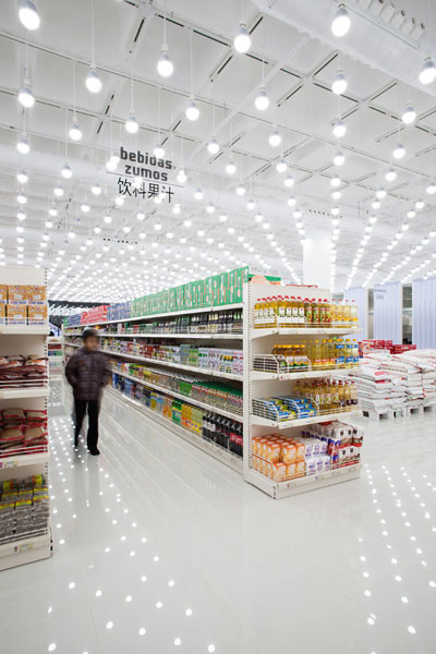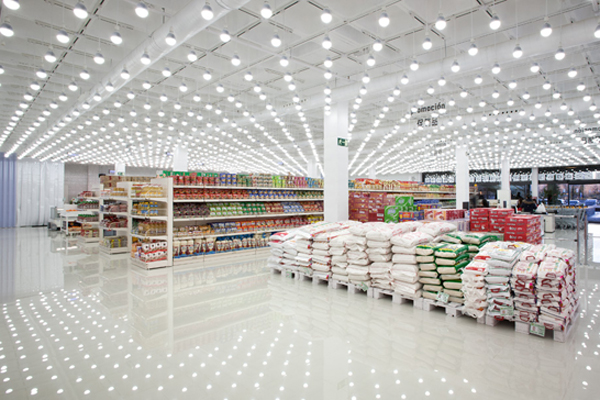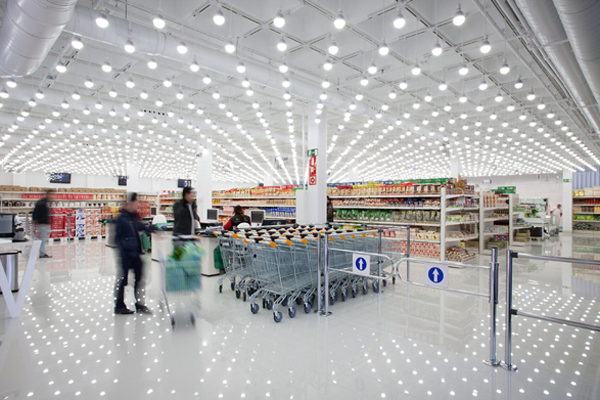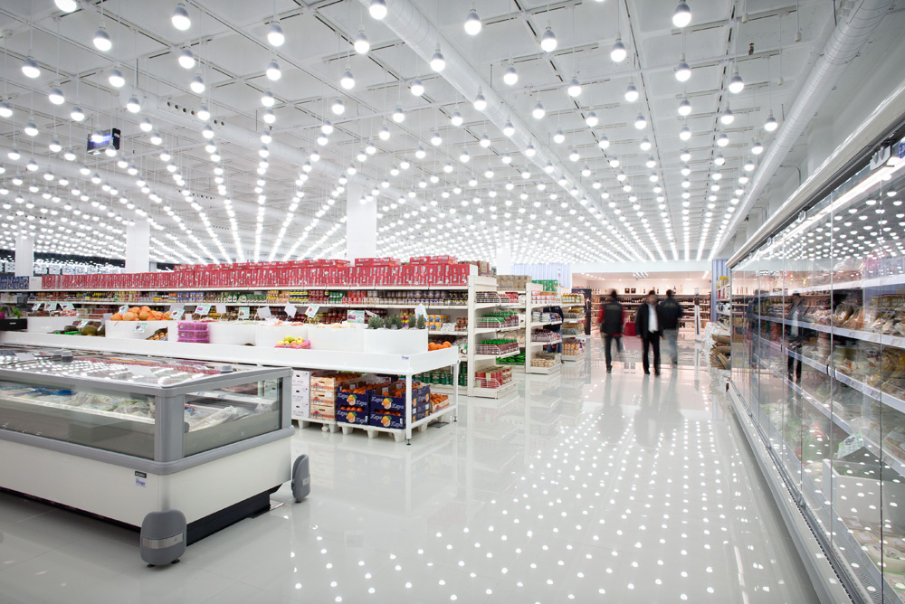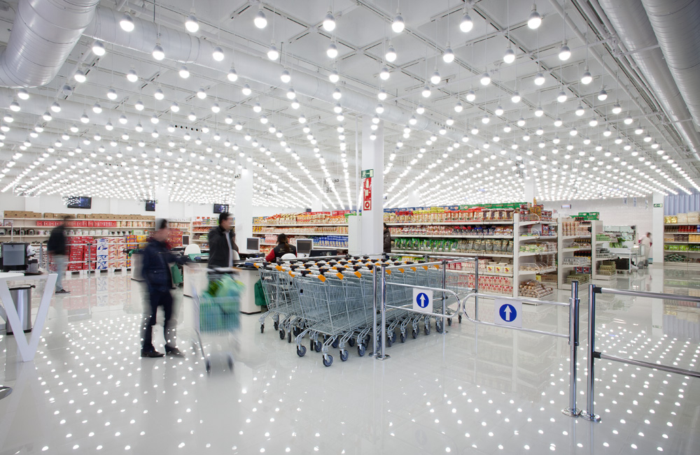 Desde la concepción del proyecto debíamos cambiar la percepción del usuario. Un lugar donde la luz fuera el hilo conductor del espacio. Debíamos mostrar el supermercado como un elemento unitario, novedoso y que potenciara los valores de pureza, modernidad, orden y pulcritud. Un ambiente aséptico que envuelve al comprador, desde el falso techo de luz hasta el reflejo de las bombillas en el suelo que lo acompañan a lo largo de su recorrido.
