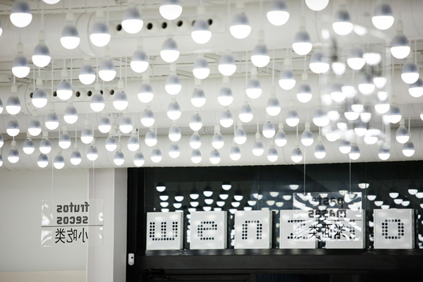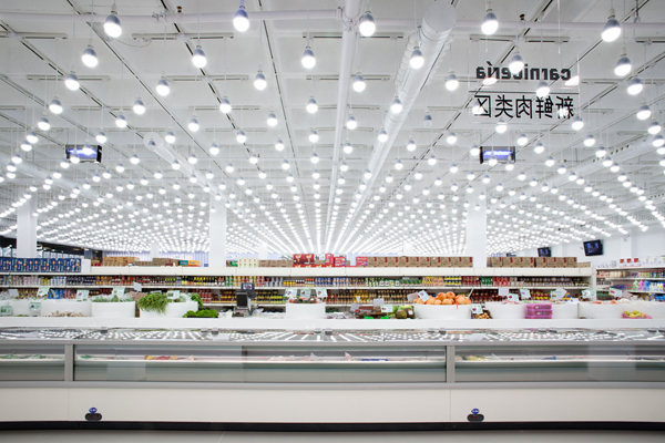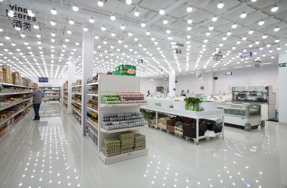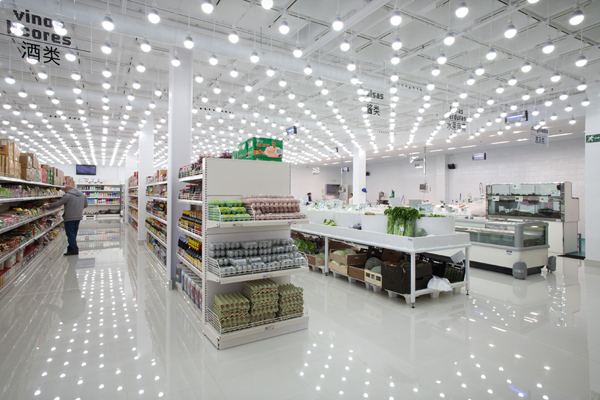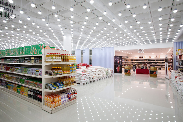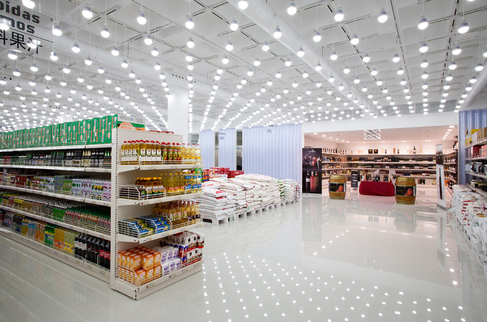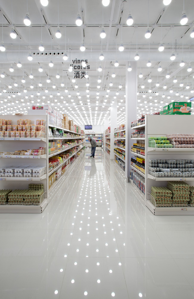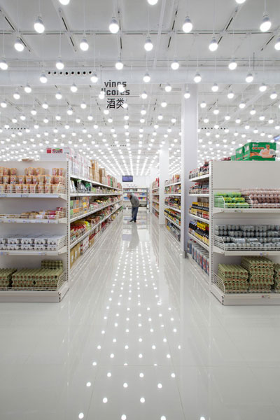 Desde la concepción del proyecto debíamos cambiar la percepción del usuario. Un lugar donde la luz fuera el hilo conductor del espacio. Debíamos mostrar el supermercado como un elemento unitario, novedoso y que potenciara los valores de pureza, modernidad, orden y pulcritud. Un ambiente aséptico que envuelve al comprador, desde el falso techo de luz hasta el reflejo de las bombillas en el suelo que lo acompañan a lo largo de su recorrido.